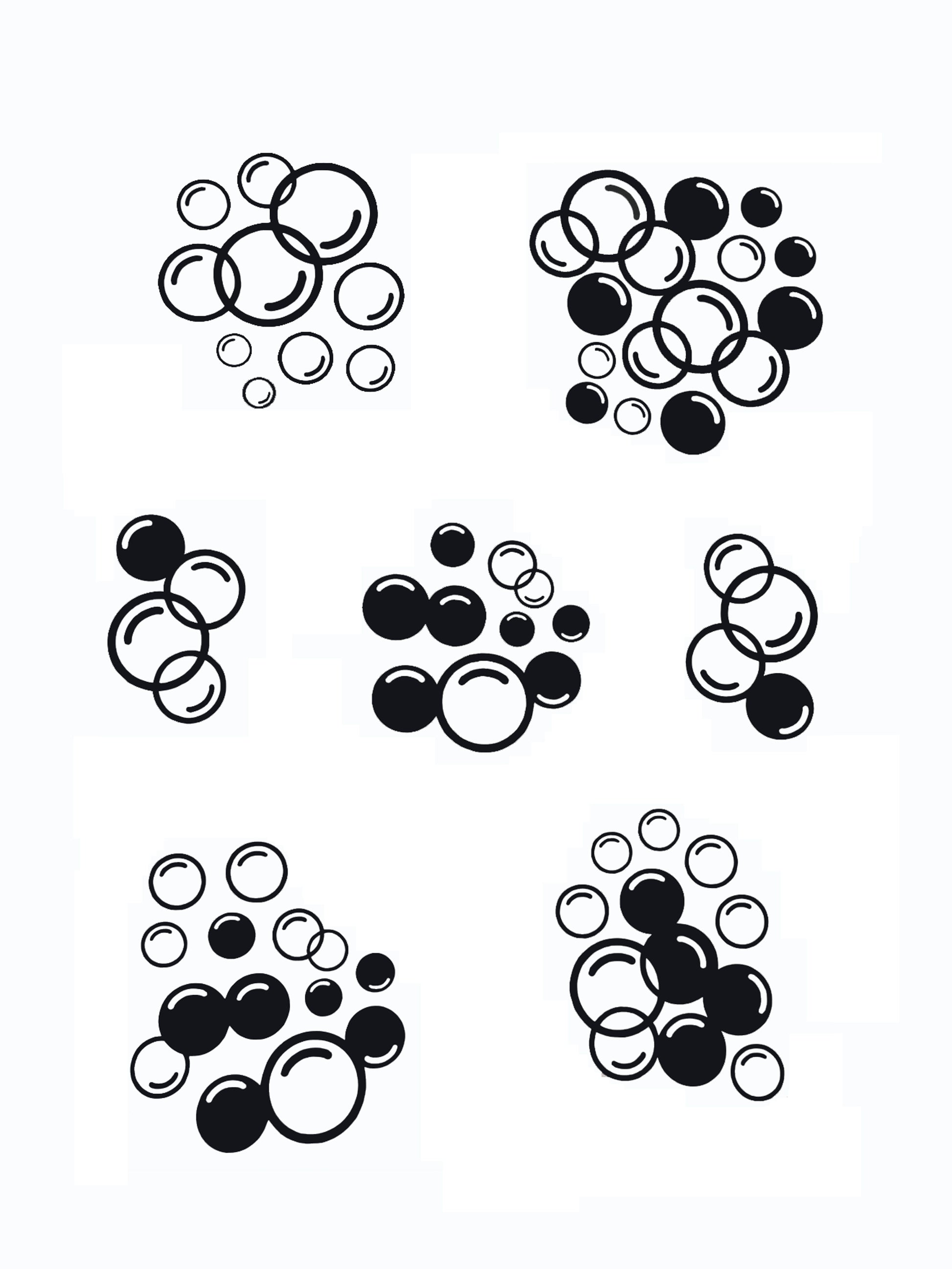 Each set contains a mix of filled and hollow bubbles and is designed for 6” x 6” tiles, with clusters measuring 3.7” high x 4” wide, 4” high x 4.1” wide, 2.8” high x 1.8” wide, 3” high x 3” wide, 3.7” high x 3.4” wide, and 3.4” high x 3.6” wide.