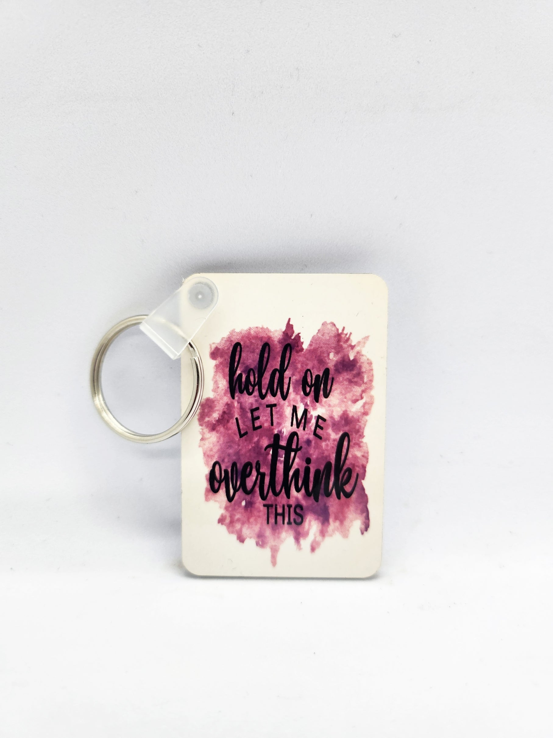This white rectangle keyring, measuring 6cm in length, 4cm in width, and 0.2cm in thickness, is emblazoned with the humorous phrase "Hold On Let Me Overthink This".