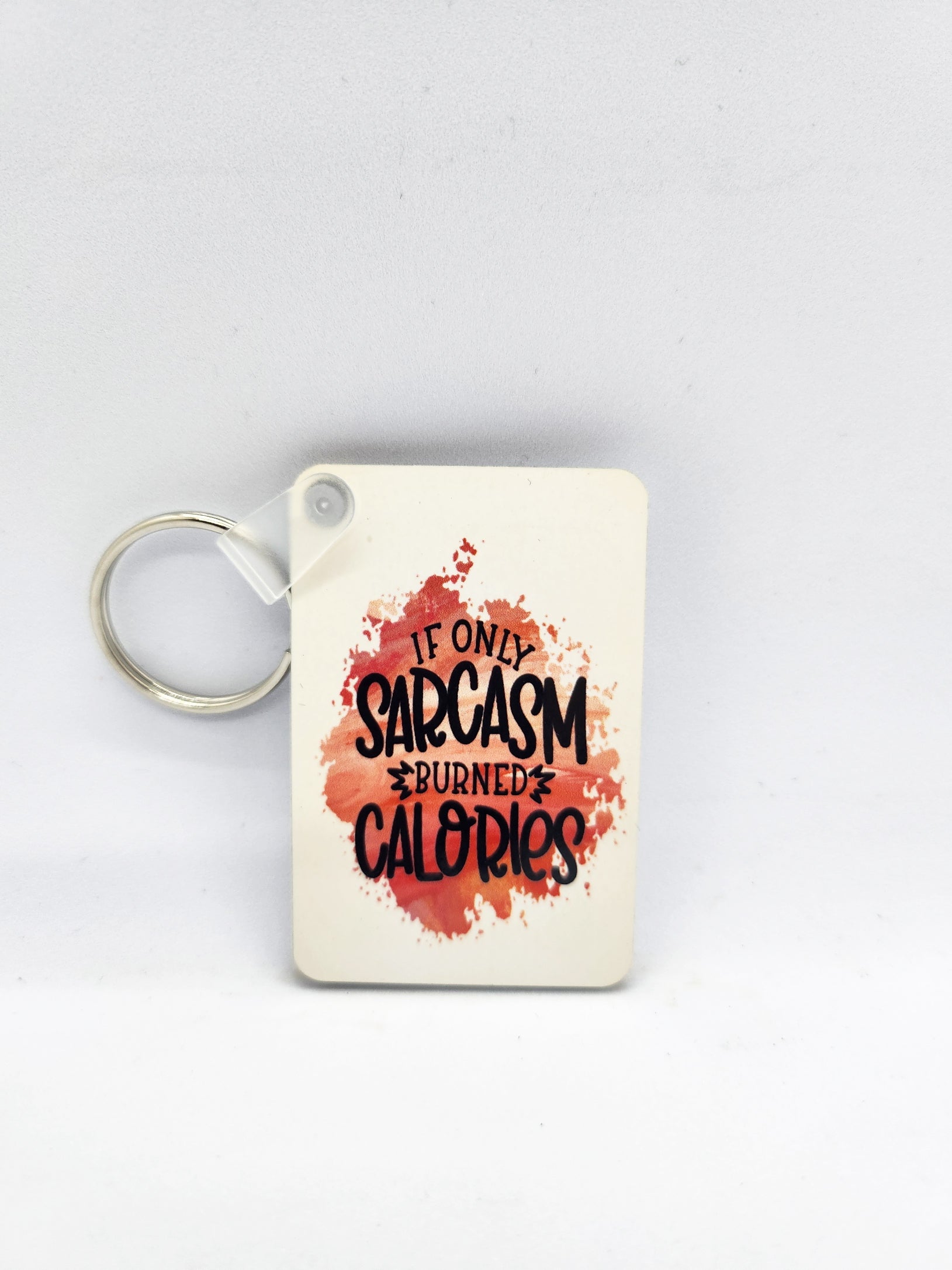This white rectangle keyring, measuring 6cm in length, 4cm in width, and 0.2cm in thickness, is emblazoned with the humorous phrase "If Only Sarcasm Burned Calories".