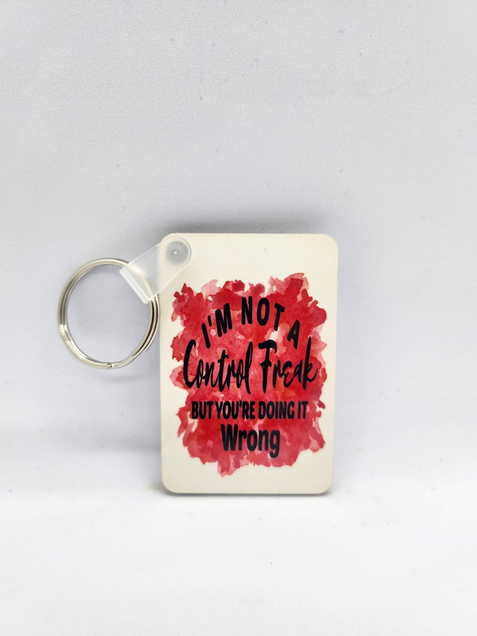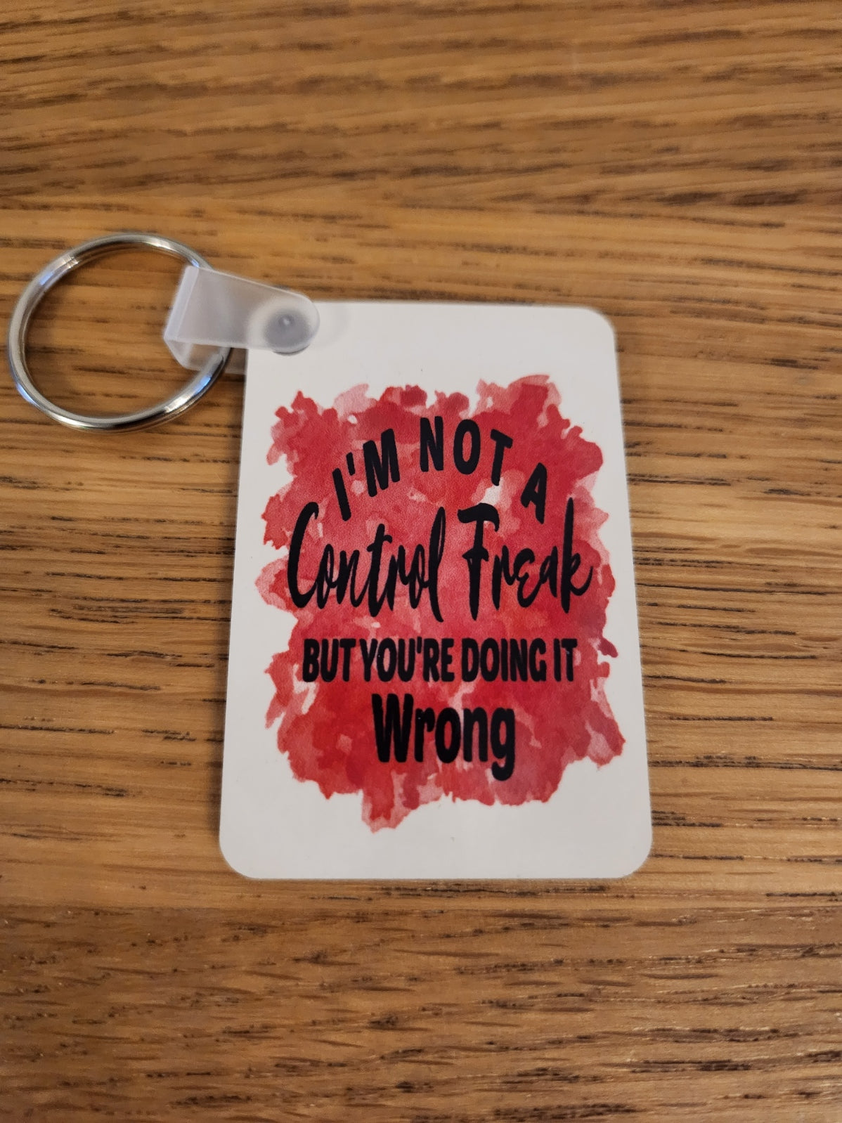 This white rectangle keyring, measuring 6cm in length, 4cm in width, and 0.2cm in thickness, is emblazoned with the humorous phrase "I'm Not A Control Freak But You're Doing It Wrong".