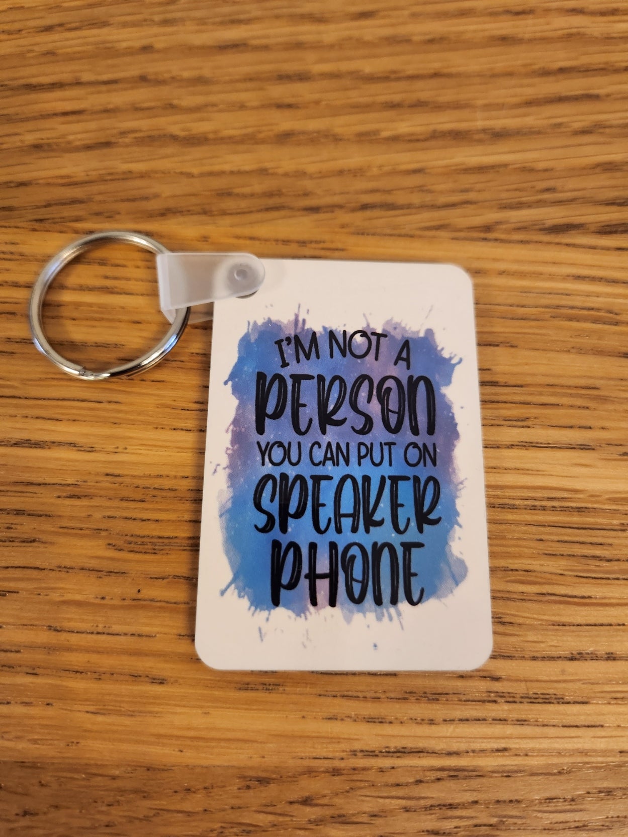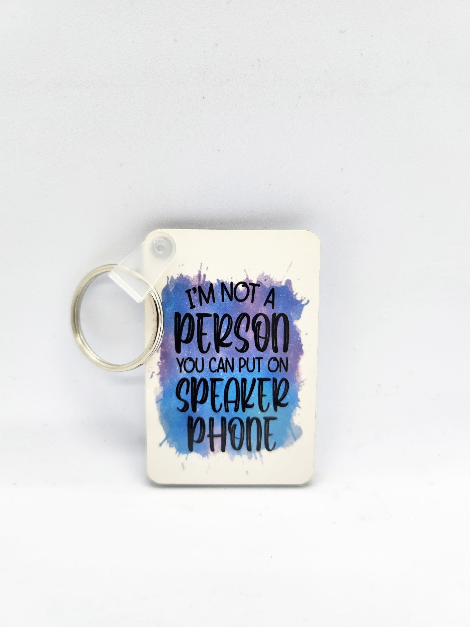 This white rectangle keyring, measuring 6cm in length, 4cm in width, and 0.2cm in thickness, is emblazoned with the humorous phrase "I'm Not A Person You Can Put On Speaker Phone".
