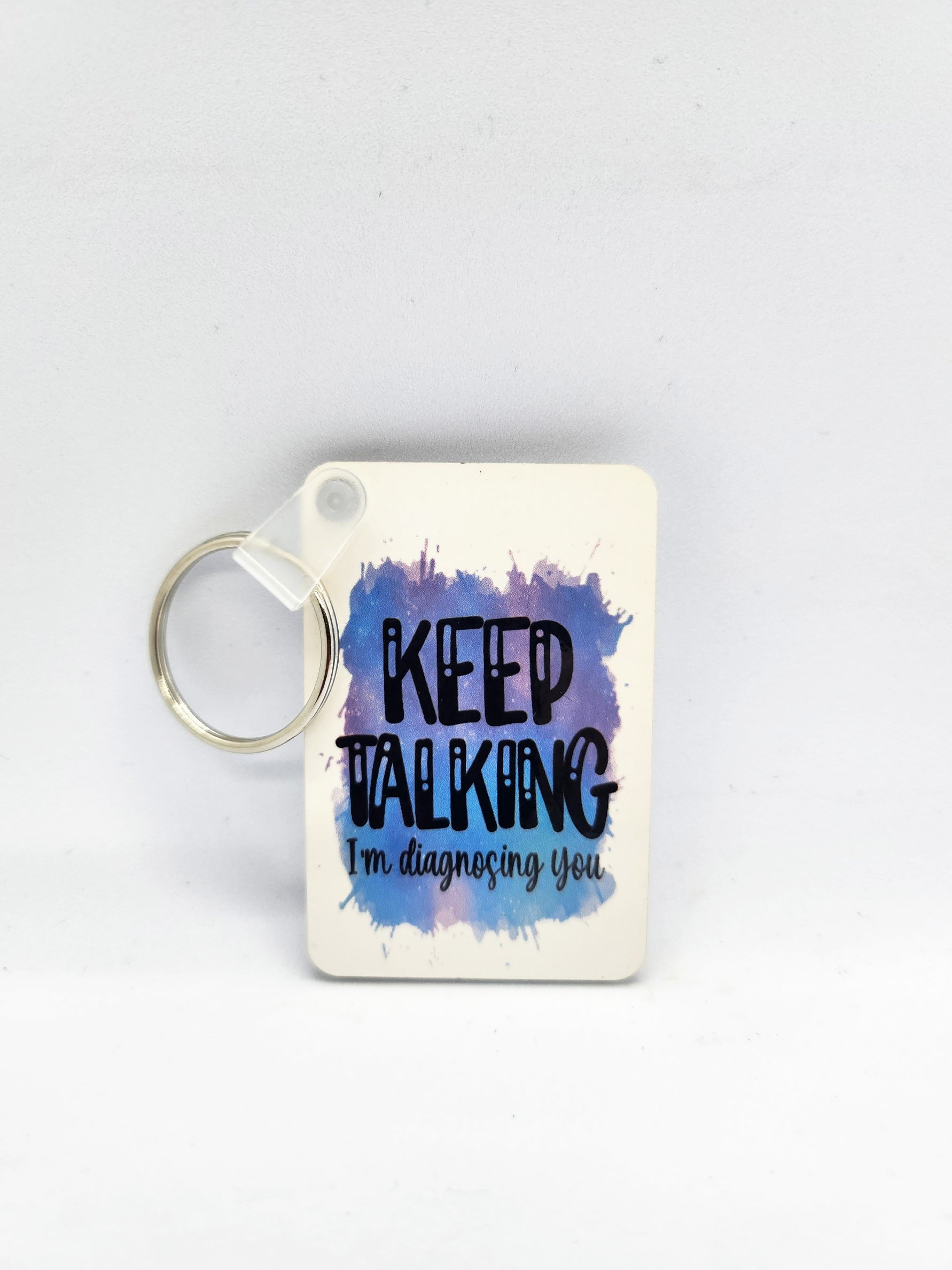 This white rectangle keyring, measuring 6cm in length, 4cm in width, and 0.2cm in thickness, is emblazoned with the humorous phrase "Keep Talking I'm Diagnosing You".