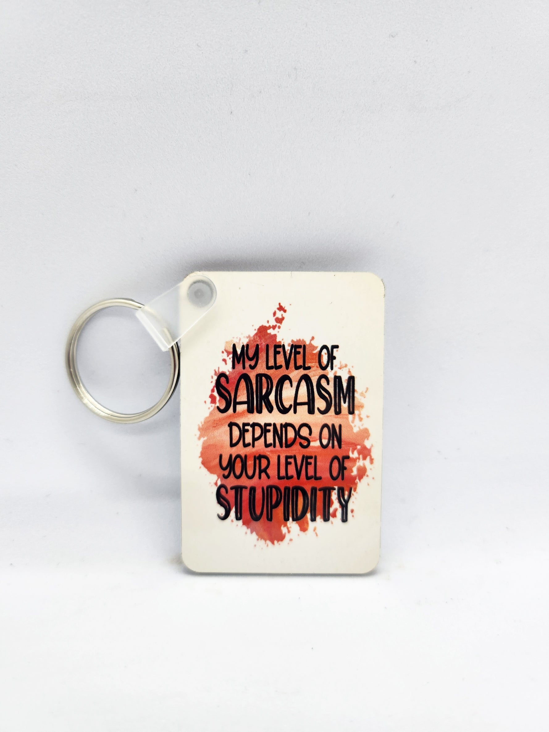 This white rectangle keyring, measuring 6cm in length, 4cm in width, and 0.2cm in thickness, is emblazoned with the humorous phrase "My Level Of Sarcasm Depends On Your Level Of Stupidity".