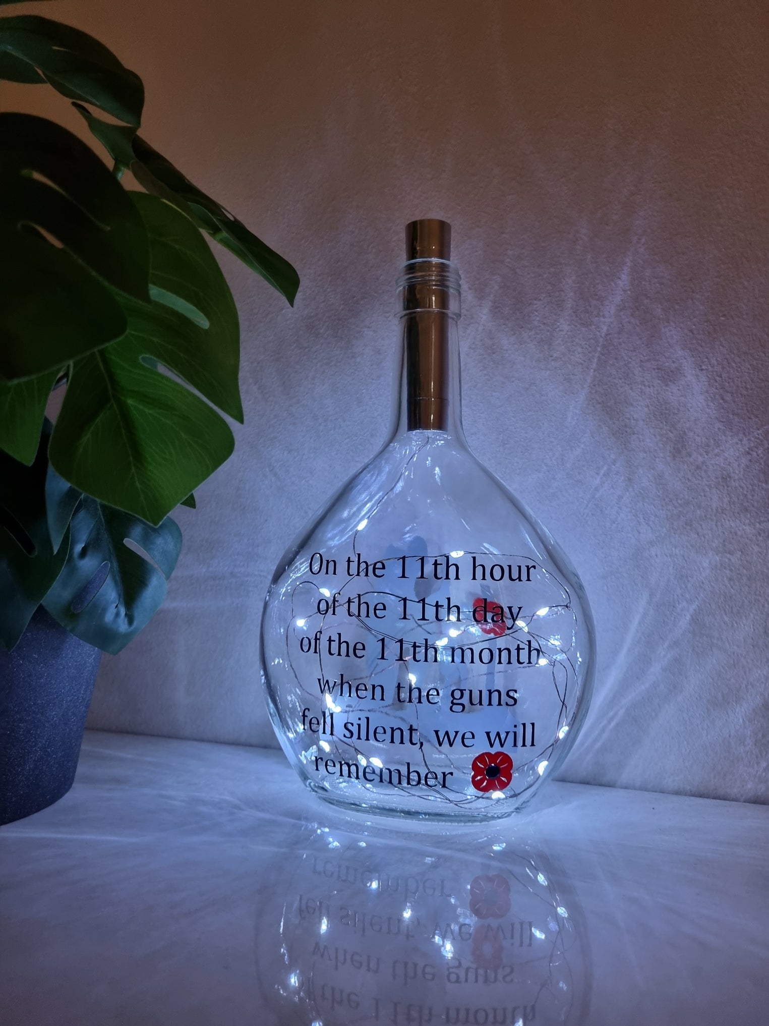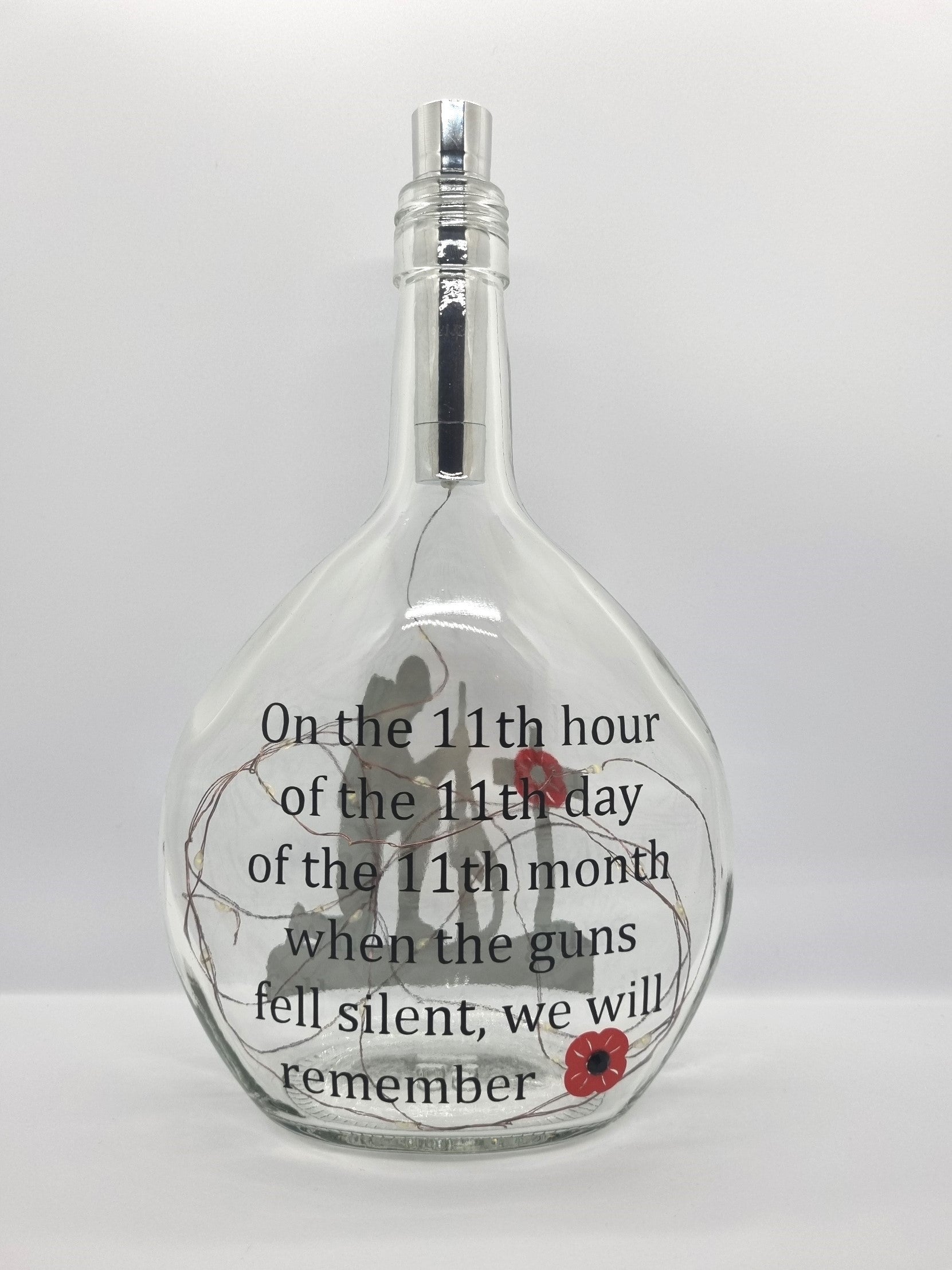 The On the 11th Hour We Will Remember Glass Night Light Bottle / Lamp is the perfect addition to any space. Featuring a metal stopper type light powered by a single AA battery (included), this stunning bottle is individually hand-made to order. Decorated with black, grey, and red vinyl, it can be used as a night light, ornament, decoration, or a unique gift.