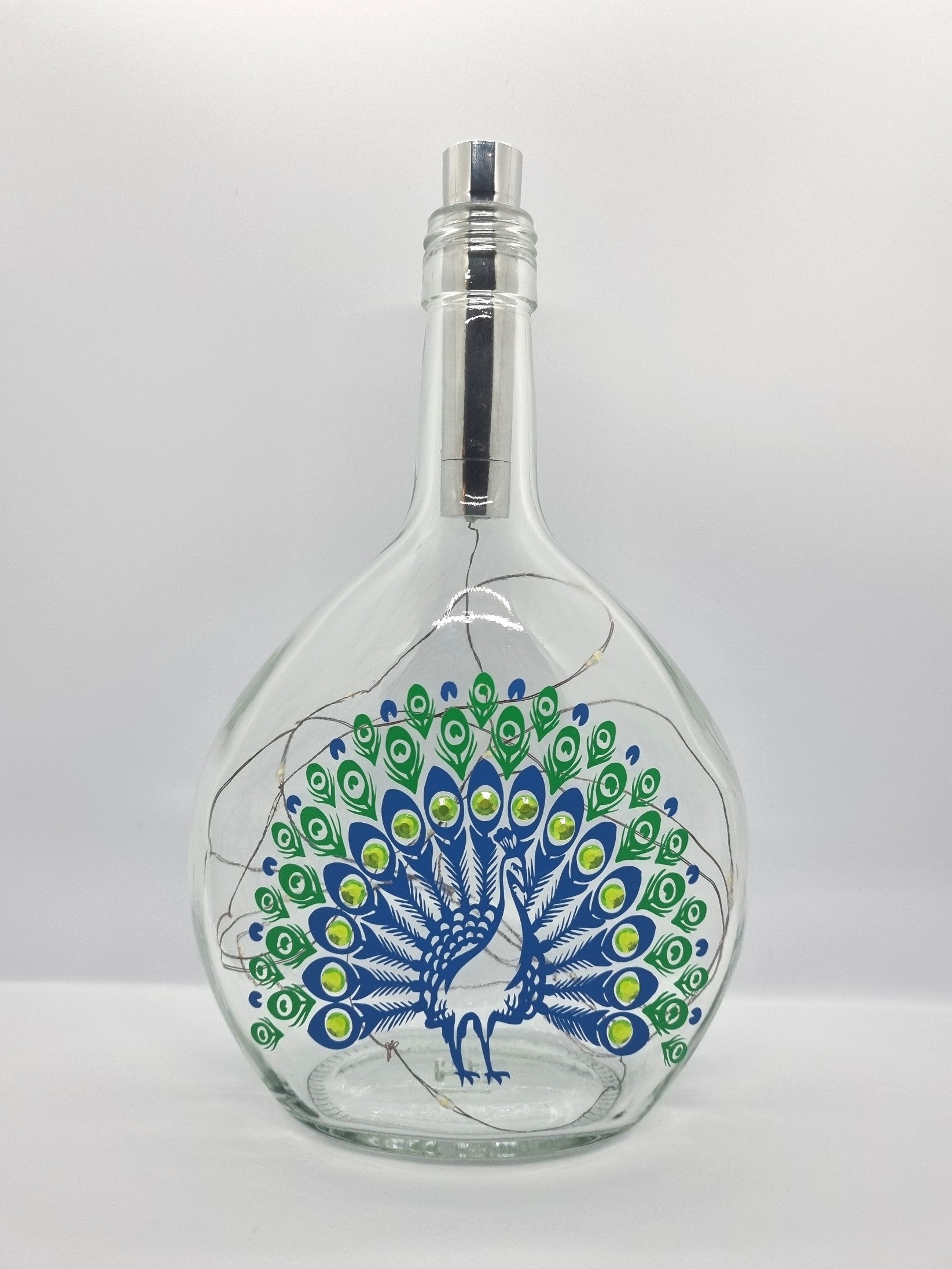 These luminous glass bottles make ideal night lights, ornaments, decorations, and gifts. A metal stopper-type light, powered by just 1 AA battery (included), is an improvement over traditional cork lights. Our design features blue and red vinyl, along with red gems, but customers may personalize their Night Light Bottles with two colours of their choice. We will then add gems based on colour selection making it a one off piece.