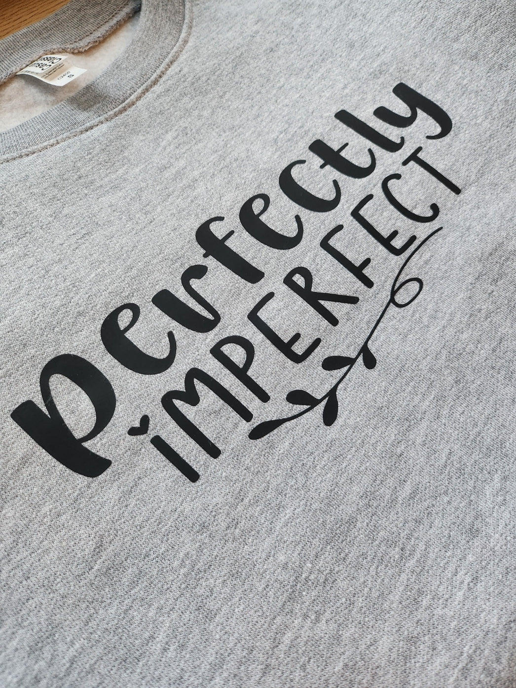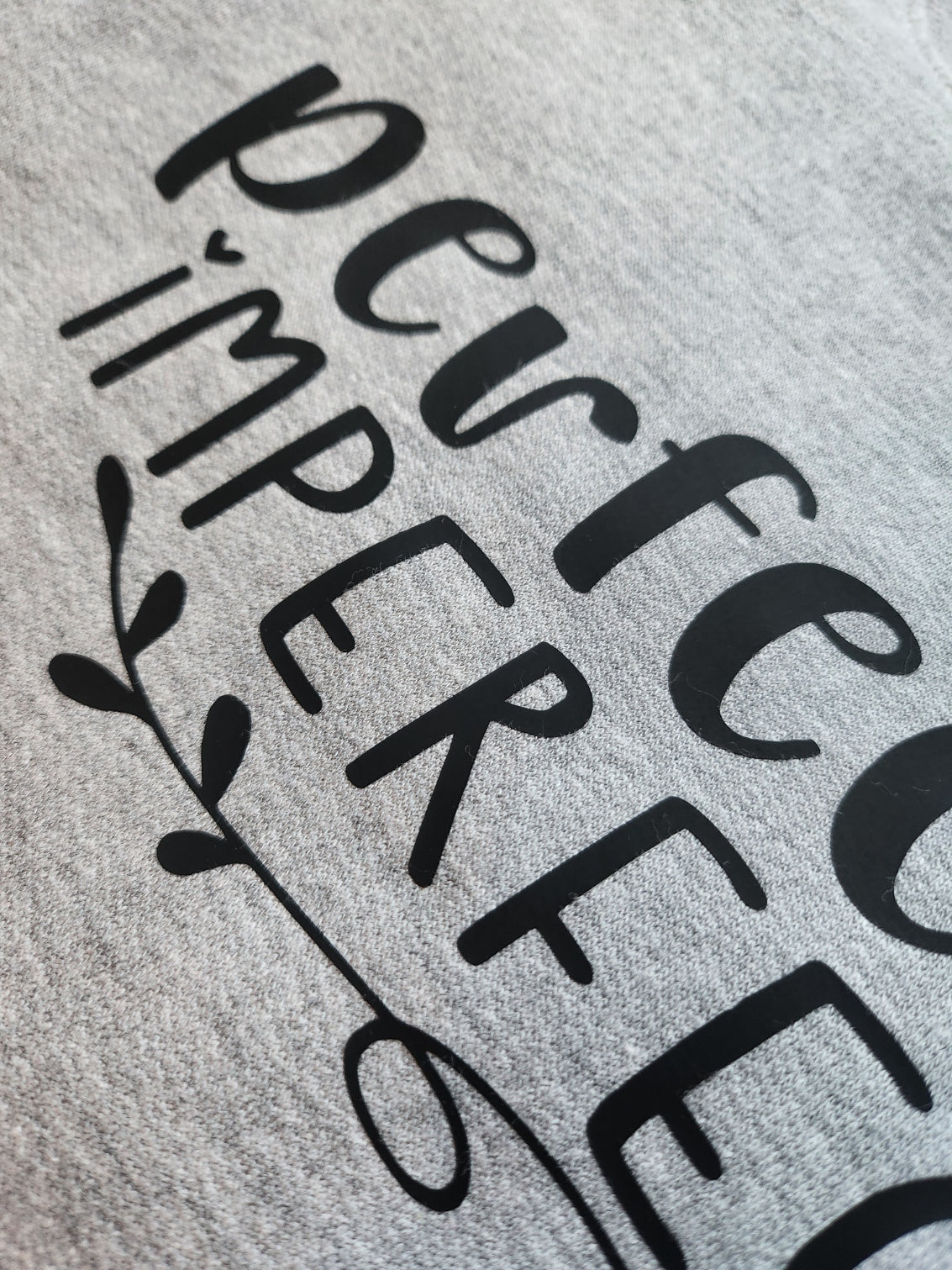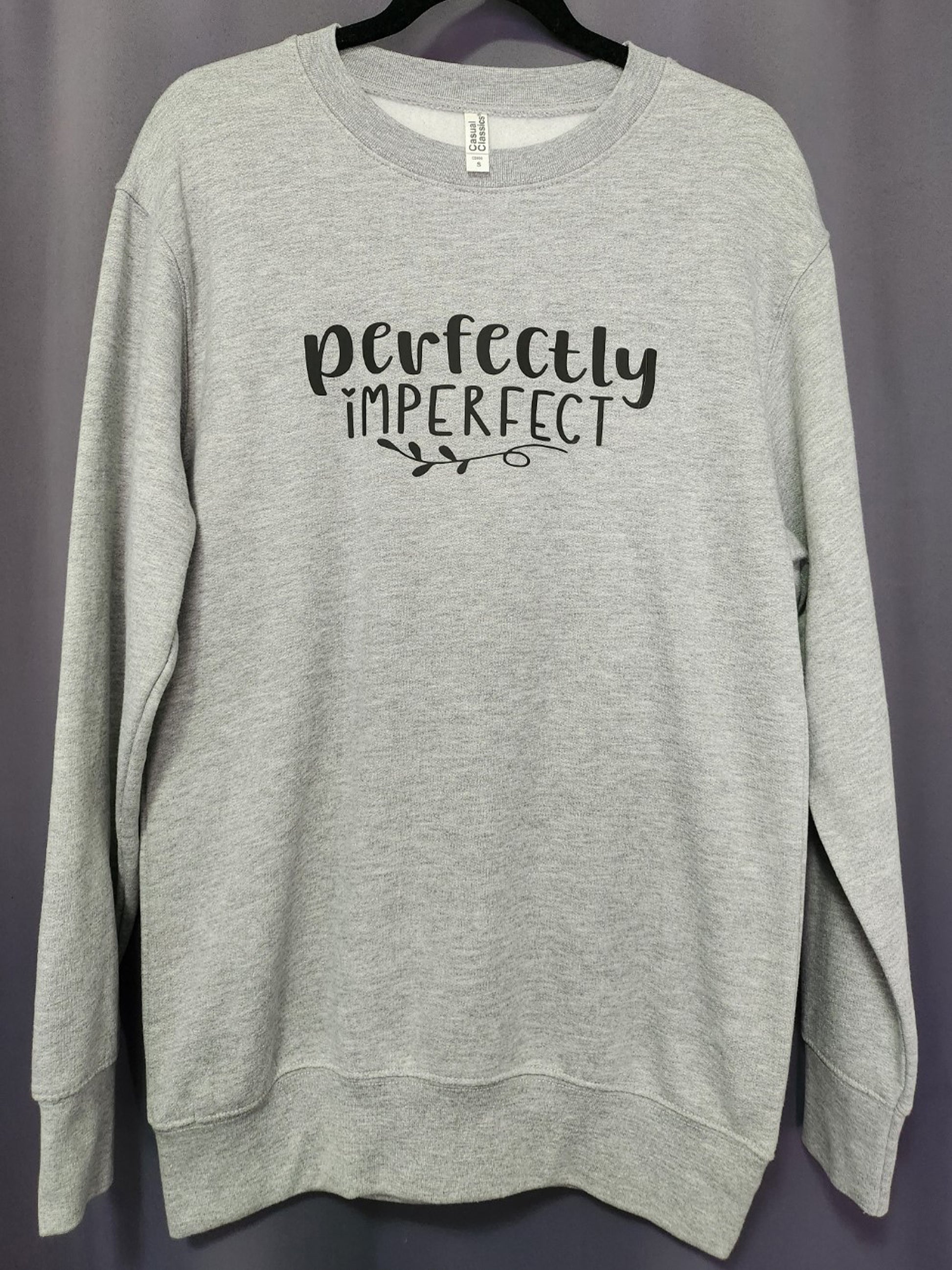 This ladies' grey sweatshirt features a round neck design and is adorned with the phrase "Perfectly Imperfect". Made from 75% cotton and 25% polyester, it is recommended to be washed cool inside out for best results.