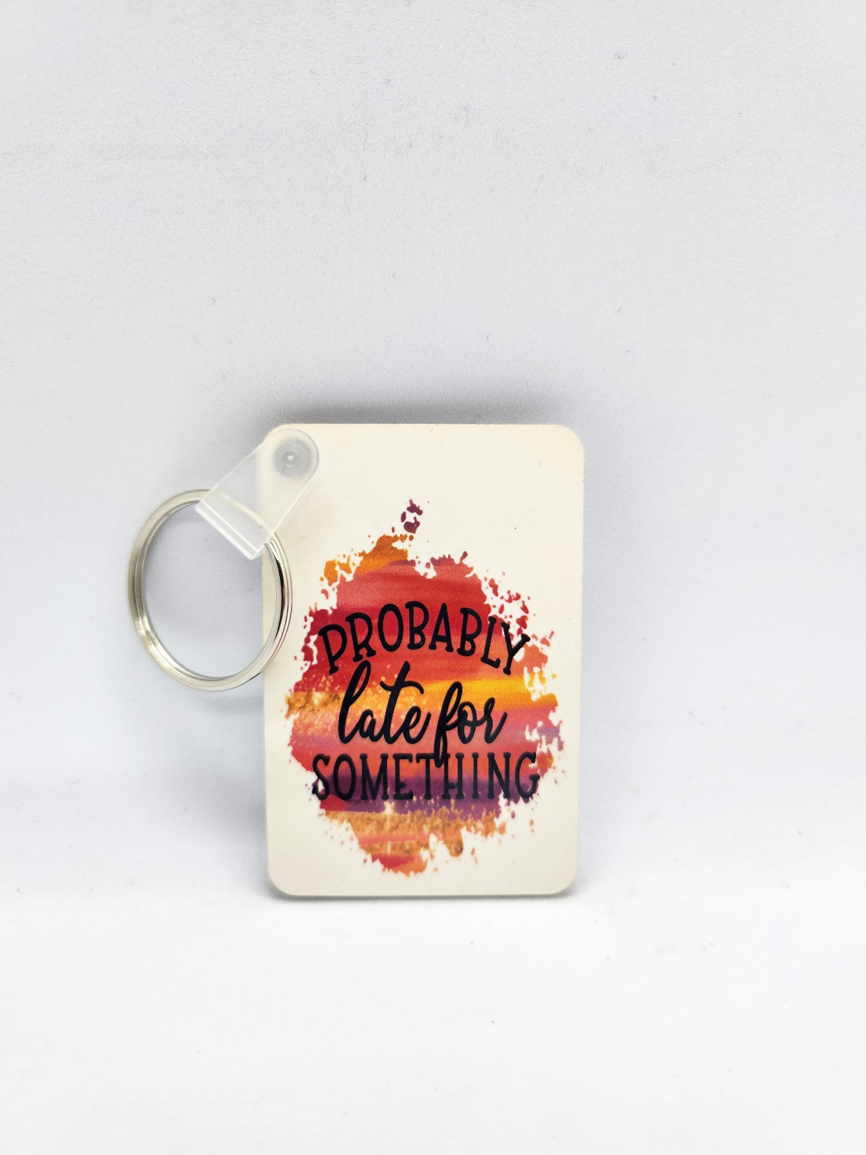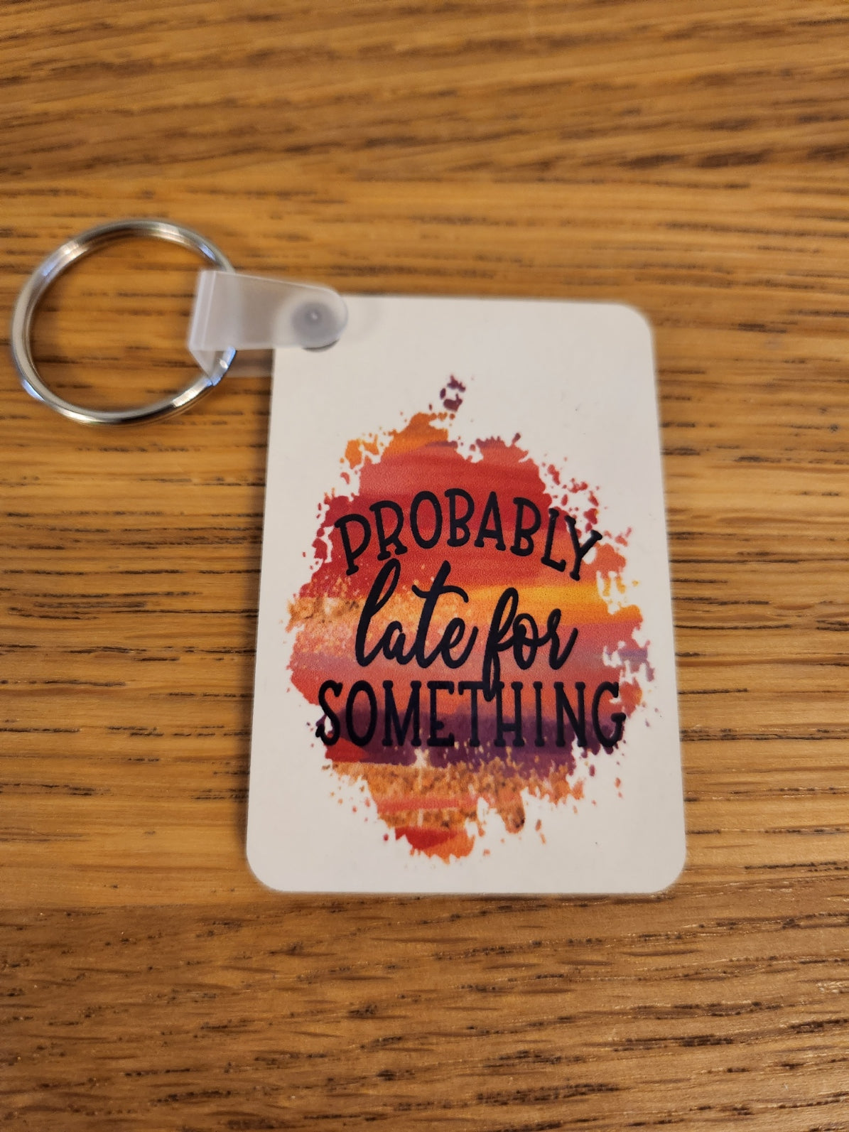 This white rectangle keyring, measuring 6cm in length, 4cm in width, and 0.2cm in thickness, is emblazoned with the humorous phrase "Probably Late For Something".