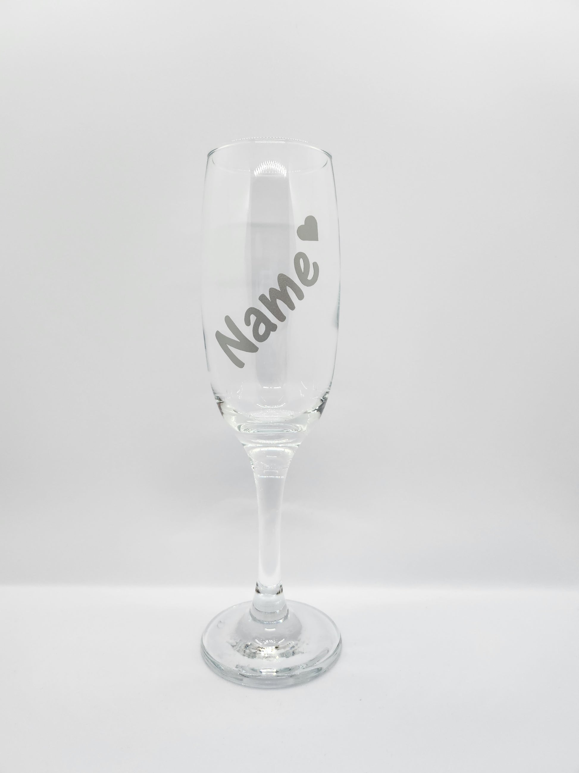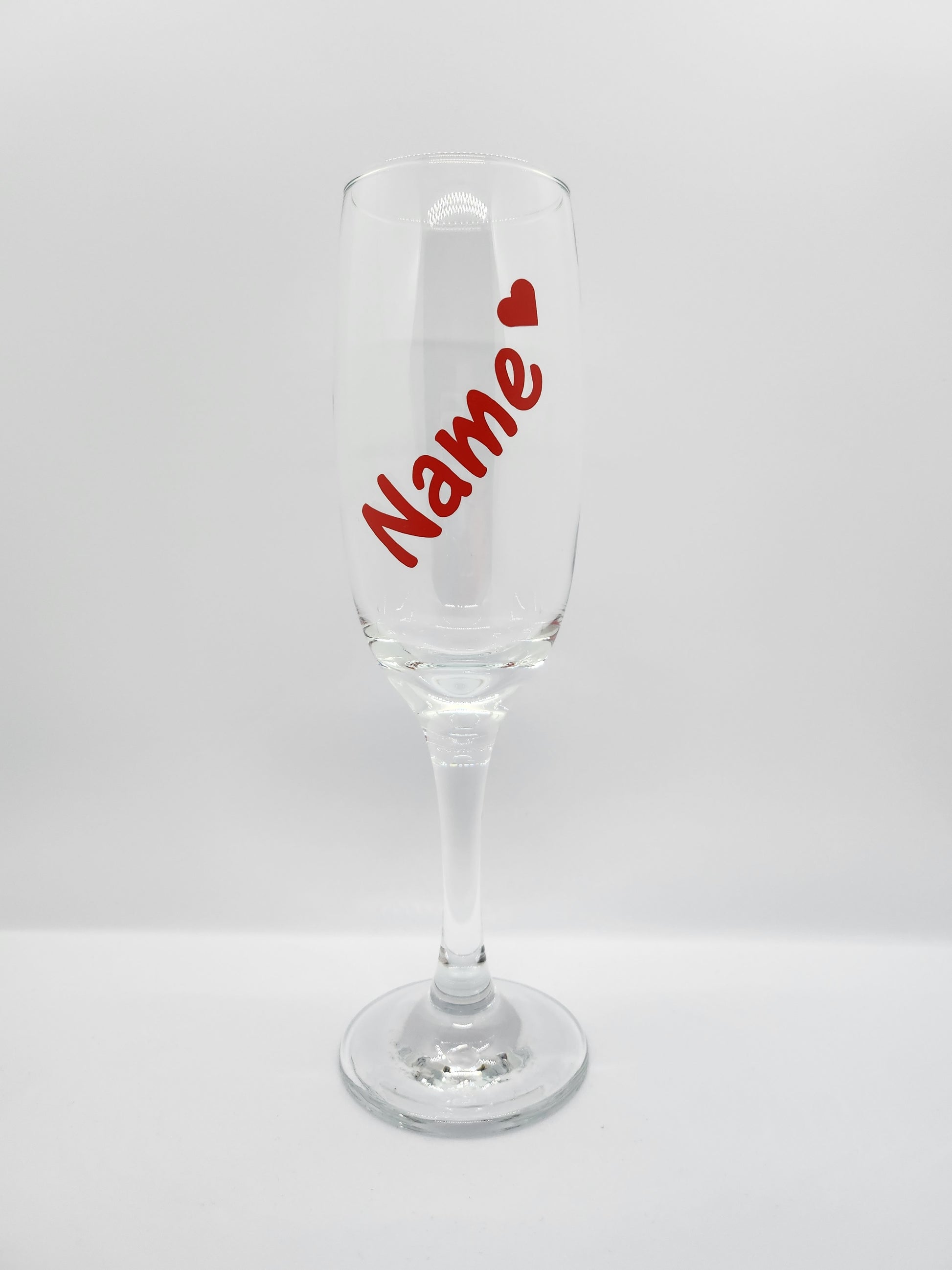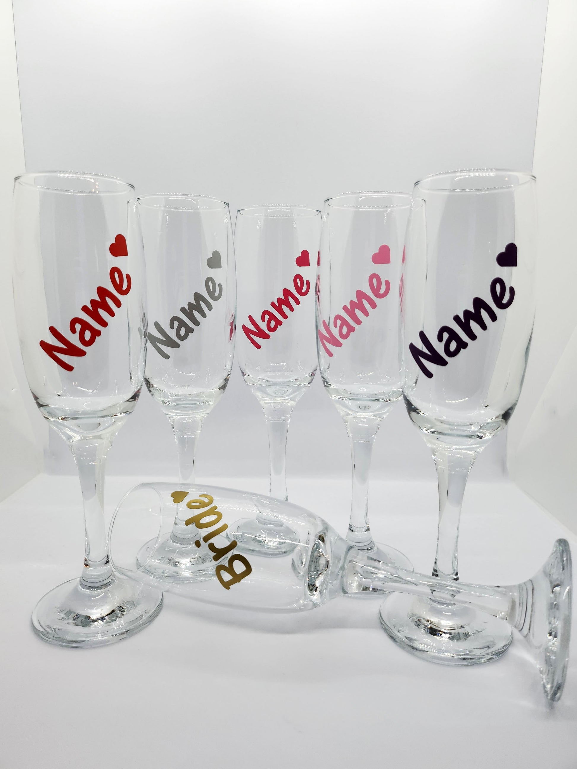 Set of 6 Personalised Word / Name / Wedding / Hen / Party Champagne Glasses with small heart decal (just add the names in the box on the cart page)
